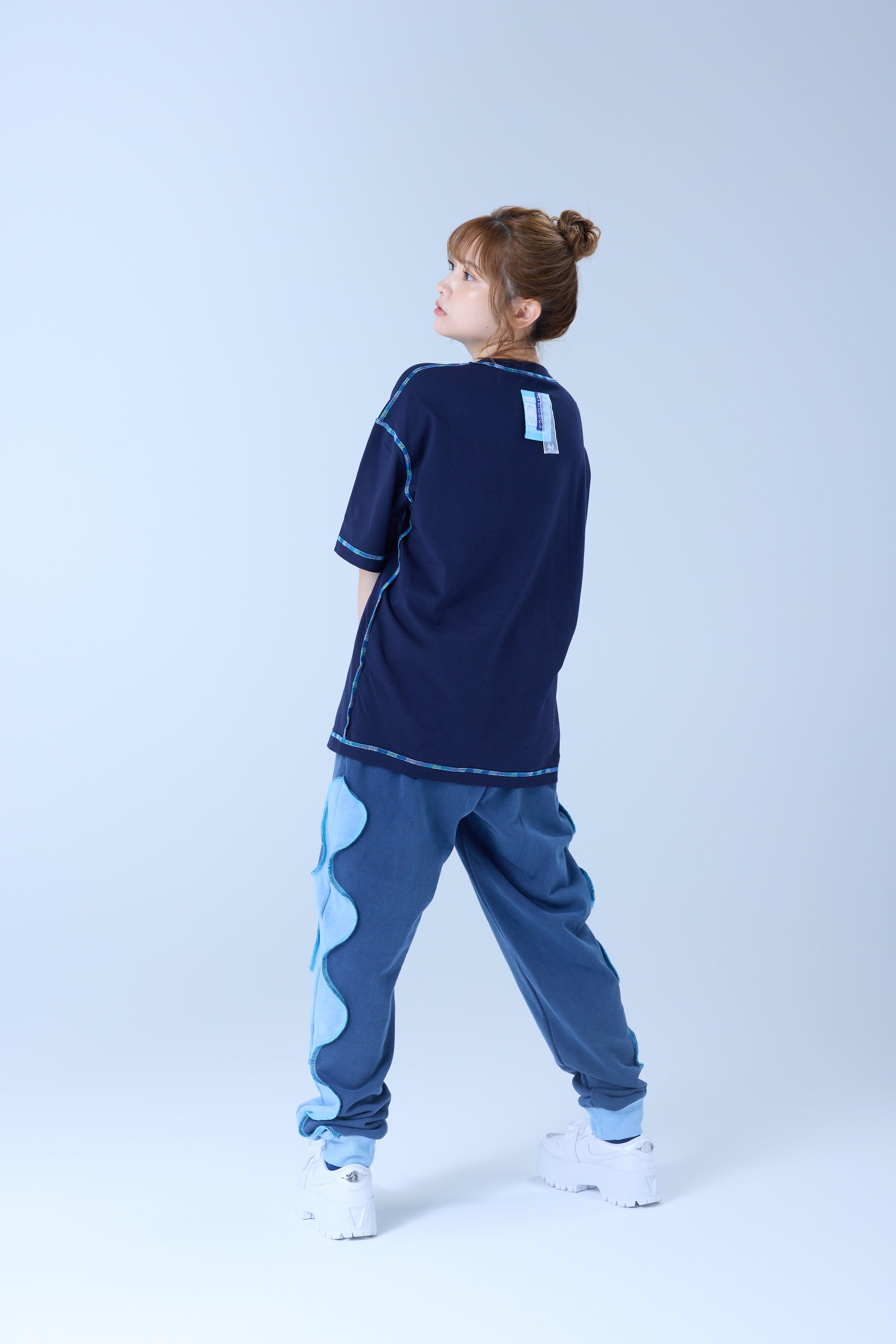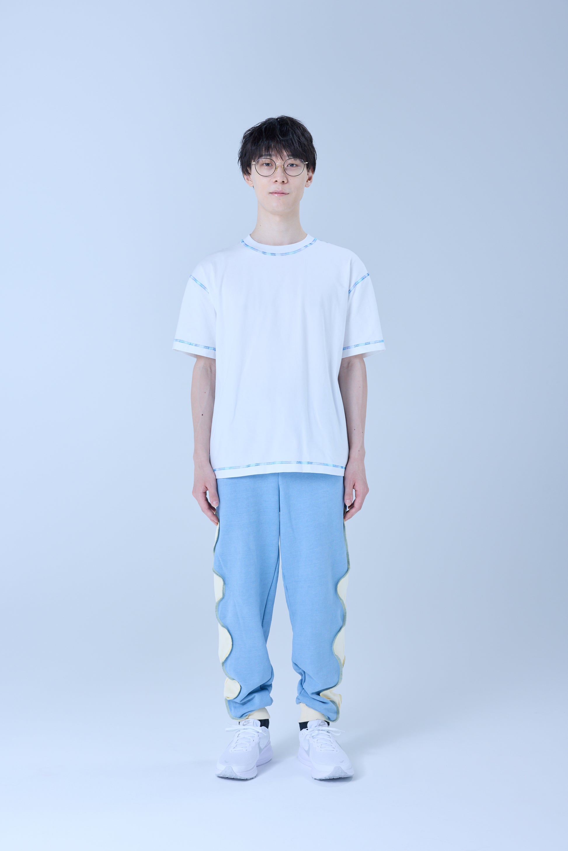 ブルーのグラデーション糸で外縫いを施し、背面には3種類のブランドオリジナルのタグをあしらったこだわりのTシャツ。